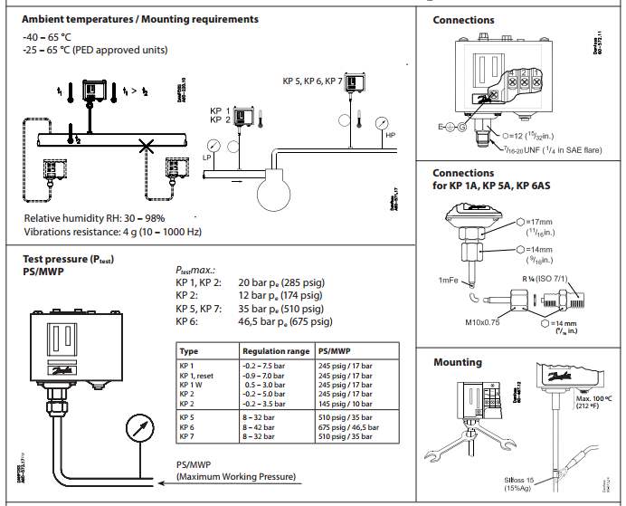 Thông số kỹ thuật công tắc áp suất Danfoss KP-1, Danfoss KP-5