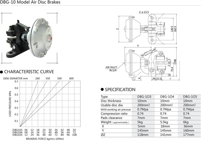 Đặc tính phanh khí nén (thắng búp sen) DBG dùng cho đĩa dày 10mm