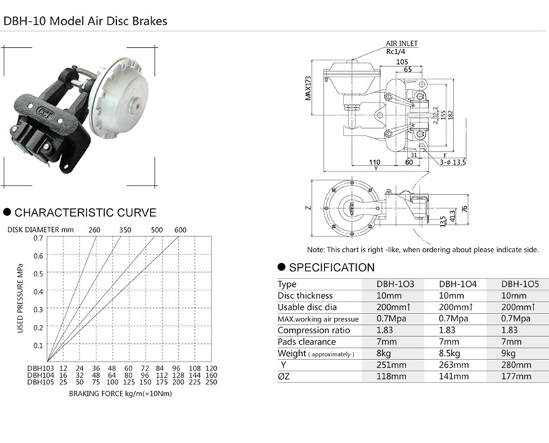 Đặc tính phanh khí nén (thắng búp sen) DBH dùng cho đĩa dày 10mm